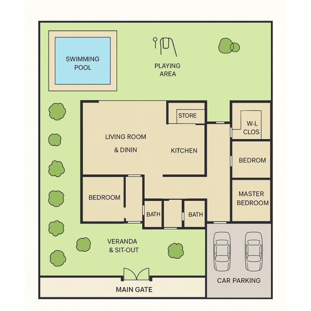 This is one of the many possible farmhouse layouts. It includes a living room & dining area, kitchen with store, three bedrooms (including a master bedroom with walk-in closet), two bathrooms, a veranda with sit-out area, car parking space, swimming pool, children’s playing area, and a garden.